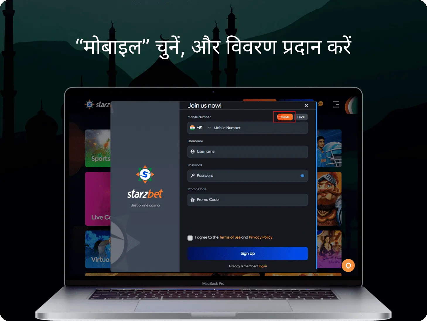 इनमें से किसी भी खेल आयोजन या गेम में सट्टा लगाने के लिए क्या ज़रूरी है? दरअसल, आपको बस Starzbet पंजीकरण कराना होगा। यह पंजीकरण ही आपके लिए सभी रास्ते खोल देगा और सभी प्रतिबंध हटा देगा ताकि आप सभी लाभों के साथ बेहतर तरीके से खेल खेलना शुरू कर सकें। मैं भारत के किसी खिलाड़ी के लिए खाता कैसे खोलूँ? आपको बस इतना करना है: