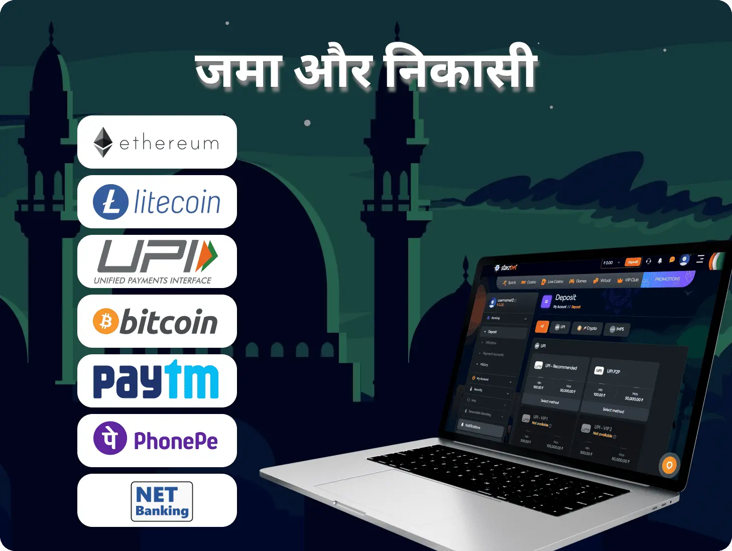 खिलाड़ियों के लिए भुगतान प्रणालियों की शायद सबसे महत्वपूर्ण बात सीमाएँ हैं। जमा करने के लिए न्यूनतम राशि केवल 300 रुपये है और अधिकतम जमा राशि 40,000 रुपये तक पहुँचती है। निकासी के लिए, न्यूनतम राशि 500 रुपये से शुरू होकर 120,000 रुपये तक पहुँच सकती है। आप भारत में उपलब्ध शीर्ष भुगतान प्रणालियों के माध्यम से भुगतान लेनदेन कर सकते हैं: